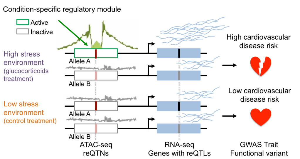 Environmental risk factors are variable in the population and contribute to health disparities. Epidemiological studies have identified several GxE risk factors, for cardiovascular and other diseases, but these findings generally lack functional validation. We characterized and functionally annotated risk variants for cardiovascular diseases in vascular endothelial cells treated with caffeine and other agents, using RNA-seq and ATAC-seq. We detected latent environmental effects and assigned a putative mechanism of action for variants associated with gene expression and coronary artery disease, through disruption of transcription factor binding. Importantly, we found that each treatment may amplify or buffer genetic risk, depending on the particular SNP or gene considered (Findley et al, Genetics, 2019). Using IPSCs and IPSC-derived cardiomyocytes, we demonstrated that context-specific genetic effects on gene regulation are pervasive across cell types and treatments, cannot be captured by large eQTL studies in one single arbitrary context (e.g. GTEx), and explain a significant fraction of heritability and risk for cardiovascular disease and other complex traits (Findley et al, eLife, 2021). We are currently participating in a NIEHS/NHGRI funded initiative to develop in-vitro functional genomics advances for GxE. We are applying the conceptual framework developed to study cellular environment, to explore inter-individual differences in gene-environment interaction responses to endocrine disruptors commonly found in plastics. We are using a combination of RNA-seq, ATAC-seq and MPRA in vascular endothelial and smooth muscle cells, to dissect the regulatory mechanisms underlying these GxE and their contribution to cardiovascular health, through colocalization and transcriptome-wide association study (TWAS) approaches.